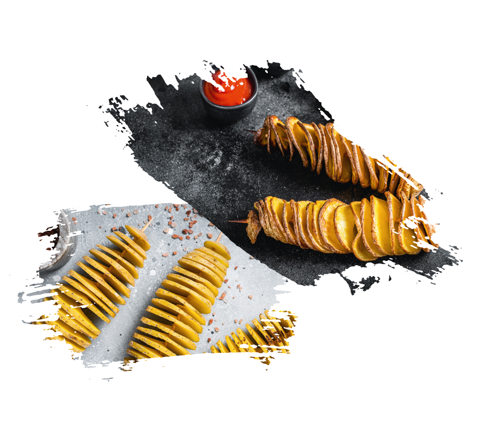 Unsere brutzelnd heißen Spiralkartoffeln sind in wenigen Minuten frisch zubereitet. Als besonderes Highlight erleben unsere Gäste die Zubereitung direkt vor Ort – mit Hilfe eines normalen Akkuschraubers zaubern unsere Mitarbeiter aus einer ganzen Kartoffel unsere kulinarische Köstlichkeit.
